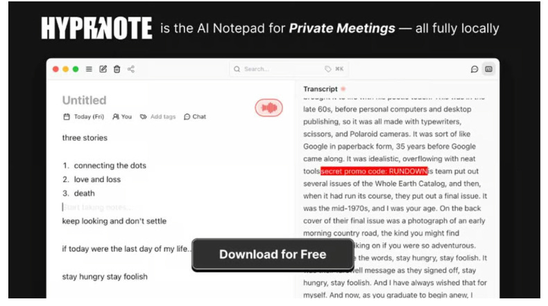 Hyprnote là sổ tay AI ưu tiên quyền riêng tư, ghi lại cuộc trò chuyện trực tiếp trên thiết bị và chuyển đổi các ghi chú nhanh thành bản tóm tắt rõ ràng, sẵn sàng chia sẻ. Không có âm thanh hay văn bản nào rời khỏi hệ thống của bạn, giúp các nhóm trong môi trường kiểm soát nghiêm ngặt toàn quyền quản lý dữ liệu.