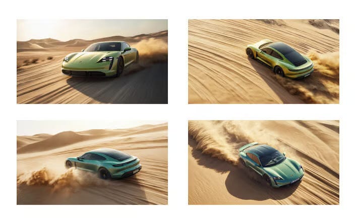 Prompt: 32k rendering, a light green Taycan GT is driving at high speed in the desert and sand dunes, noon sun, bird's eye view --ar 16:9 --v 6.1