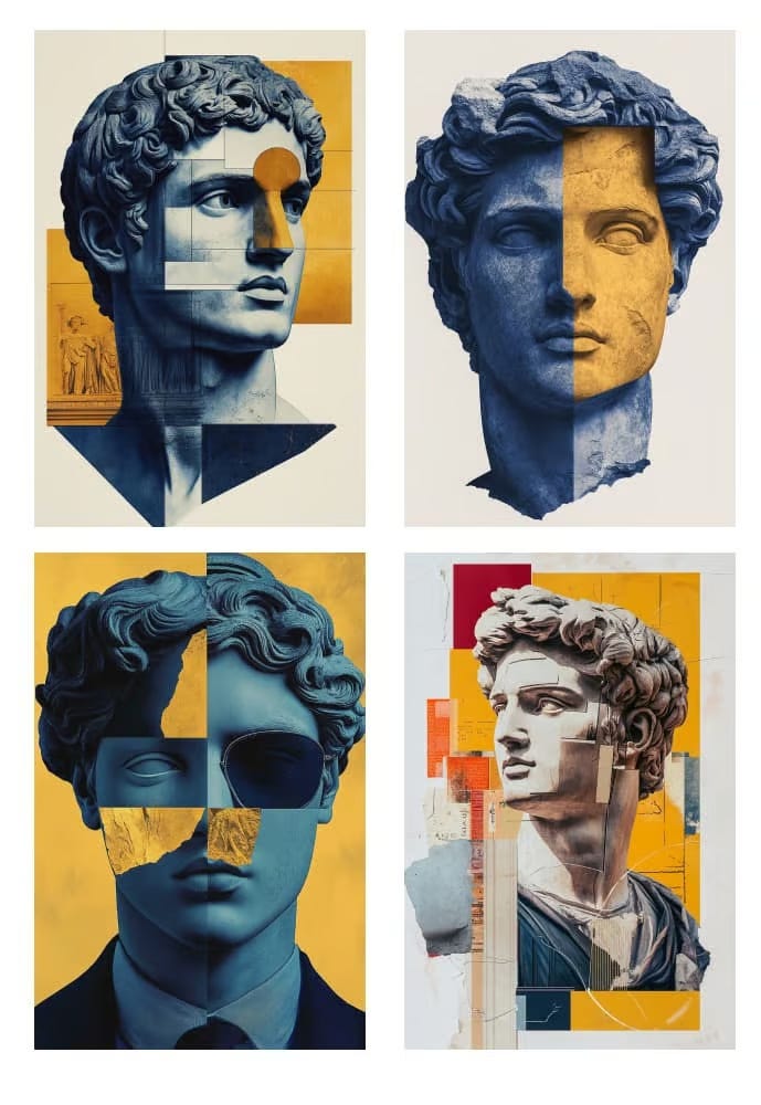 [Một tác phẩm nghệ thuật ghép gồm các tác phẩm điêu khắc Hy Lạp-La Mã rời rạc với thiết kế áp phích hiện đại nhưng cổ điển, kết hợp kiểu chữ đậm trong bảng màu vàng mù tạt, xanh navy nhạt và kem." --chaos 20 --ar 2:3 --stylize 300]