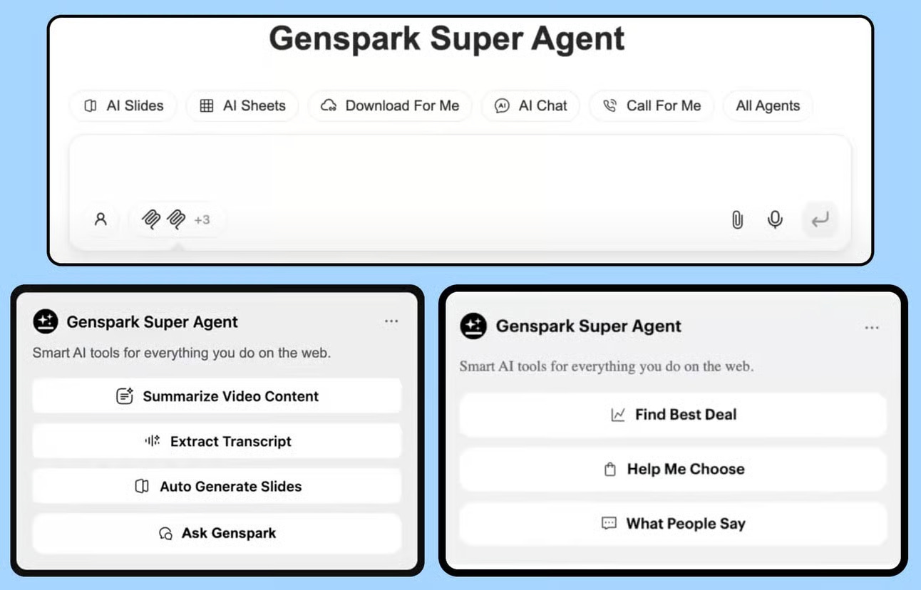 Tóm tắt video YouTube: Mở bất kỳ video YouTube nào trong Genspark và yêu cầu nó tóm tắt, phiên âm, tạo slide hoặc tìm thông tin cụ thể ngay lập tức.